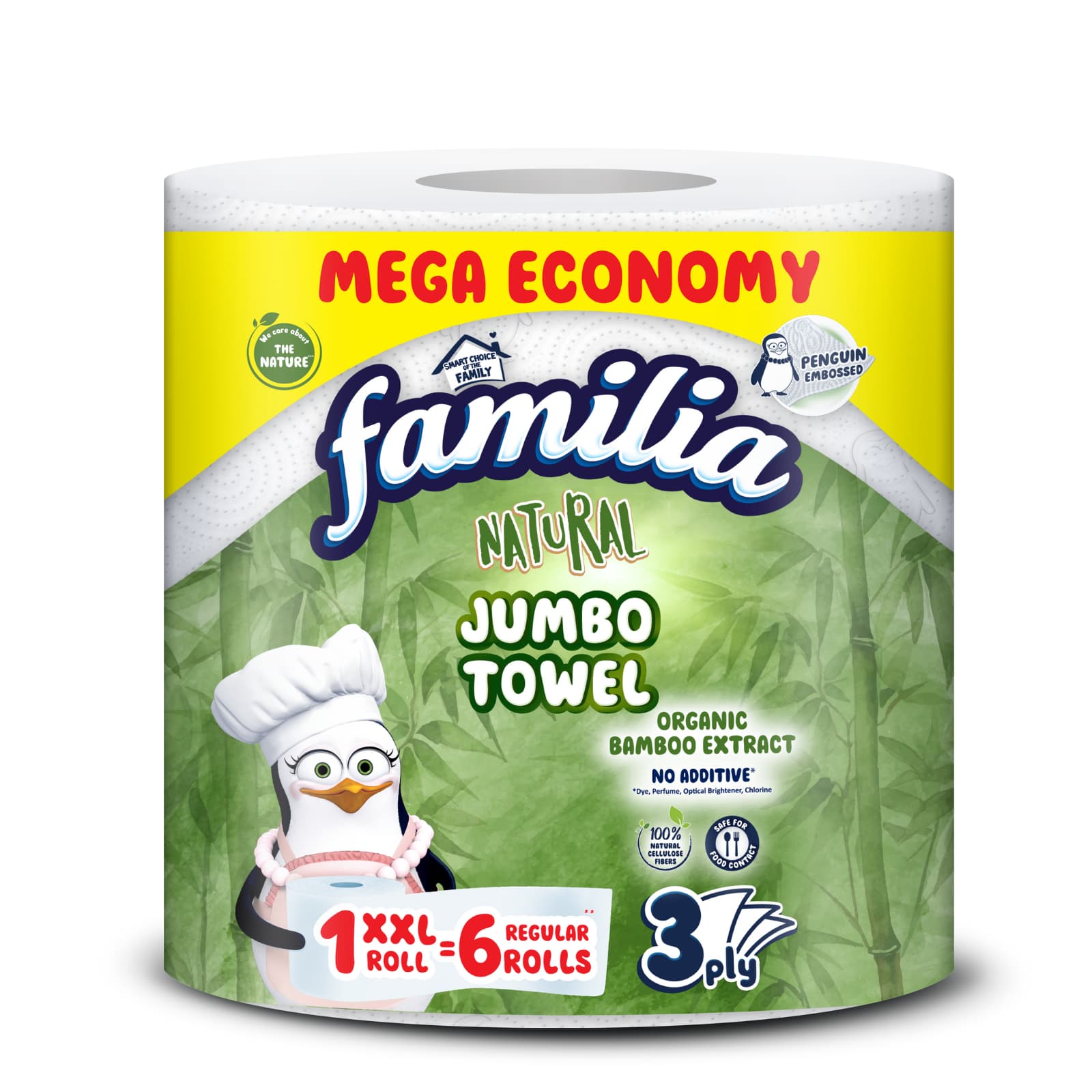 Ręczniki kuchenne FAMILIA Natural Jumbo to ekologiczny i ekonomiczny wybór dla Twojego domu. Wzbogacone organicznym ekstraktem z bambusa, są niezwykle wytrzymałe i miękkie, oferując jednocześnie 100% bezpieczeństwa dla Twojej rodziny i środowiska.